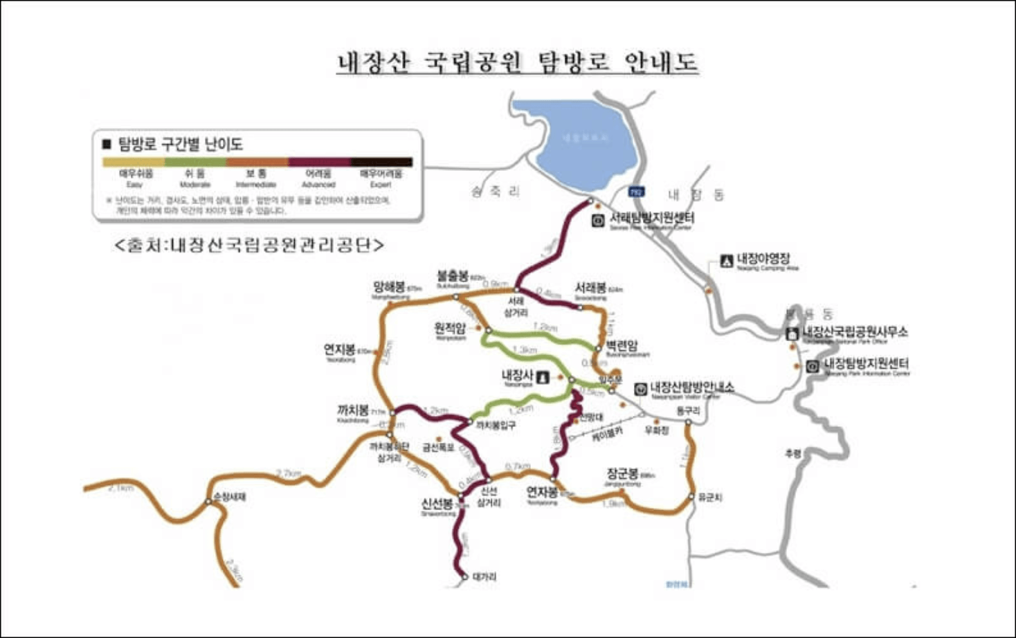 - 서래봉 코스: 왕복 약 5.9km, 평균 4시간 소요. 단풍 절경이 뛰어나 가장 인기 있는 코스예요.