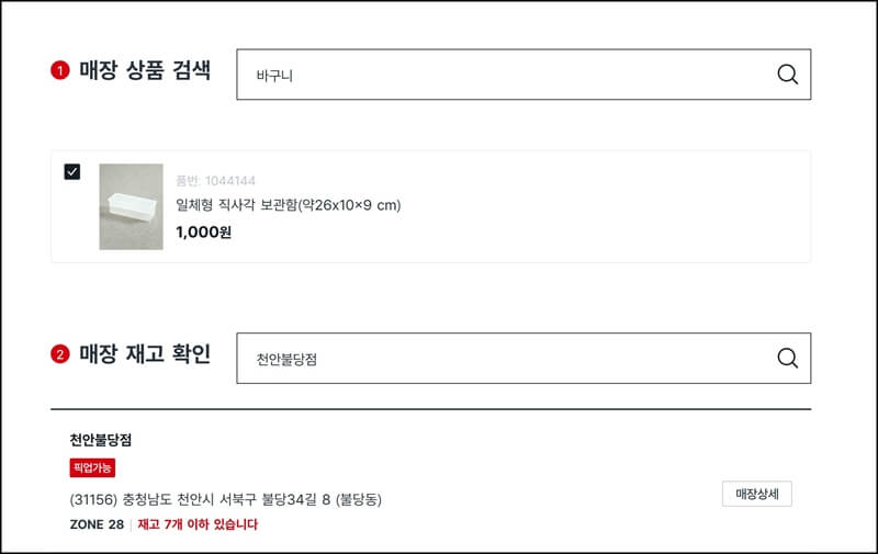- 상품 상세 페이지에서 ‘매장 재고 확인’ 버튼을 누르면 주변 매장의 재고 여부가 표시됩니다.