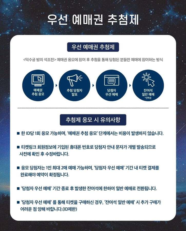 일반 관람객은 티켓링크를 통한 우선 예매권 추첨제 방식으로만 표를 구합니다. 3월 18일 오후 2시부터 24일 자정까지 응모를 진행하며 당첨자는 26일 오후 5시 이후에 발표합니다. 당첨된 분들에 한해 27일부터 30일까지 우선 결제 기간이 주어집니다. 복잡해 보일 수 있으나 덕수궁 석조전 관람예약 야간개장 예매 방법 중 가장 핵심적인 단계이므로 응모 기간을 놓치지 않도록 주의해야 합니다.