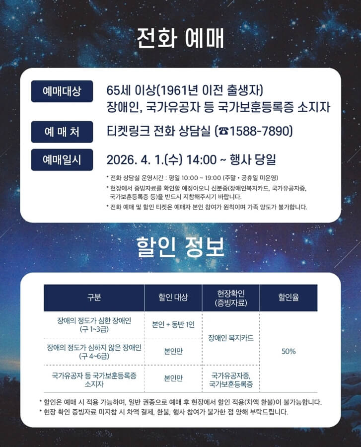 온라인 접근이 어려운 만 65세 이상 어르신이나 장애인 및 국가보훈등록증 소지자는 전화로 표를 구합니다. 4월 1일 오후 2시부터 티켓링크 전화 상담실을 통해 접수를 시작하며 행사 당일까지 운영합니다. 이 경우 현장에서 반드시 증빙 서류 원본을 확인하므로 잊지 않고 지참해야 합니다. 해당 대상자분들은 덕수궁 석조전 관람예약 야간개장 예매 방법으로 전화 접수를 활용하시면 더욱 편리합니다.