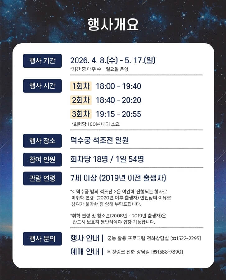 이번 행사는 2026년 4월 8일부터 5월 17일까지 매주 수요일부터 일요일까지 운영합니다. 하루에 총 3회차로 나누어 진행하며 각 회차당 소요 시간은 약 100분 내외입니다. 안전상의 이유로 미취학 아동은 입장이 제한되며 7세 이상만 참여가 가능합니다. 덕수궁 석조전 관람예약 야간개장 예매 방법을 확인하기 전 본인과 동반자의 나이 조건이 부합하는지 먼저 점검하는 과정이 필요합니다.