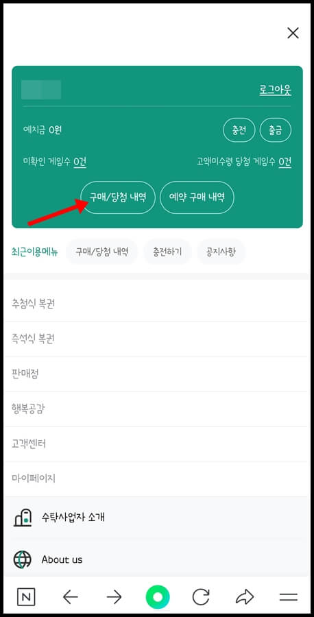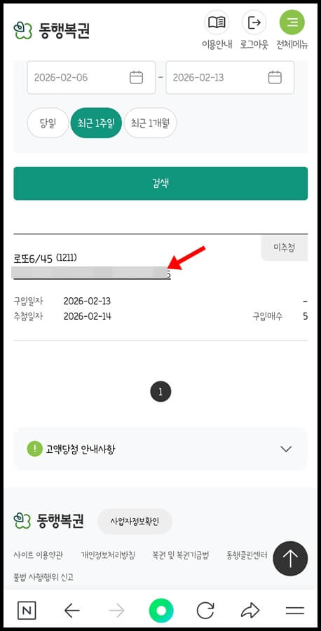 4. 그렇게 본인이 구매한 모바일 로또는 메뉴 > 구매/당첨내역으로 들어가면 확인할 수 있고, 해당 번호를 클릭하면 티켓으로 확인도 가능합니다.