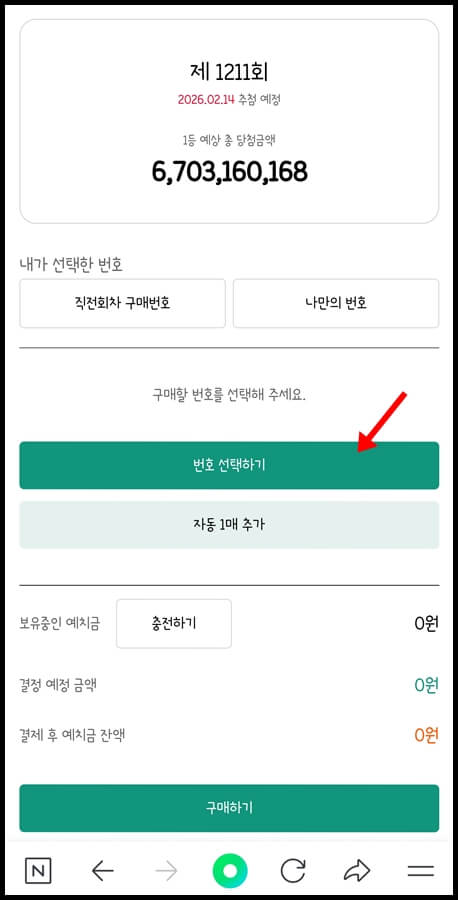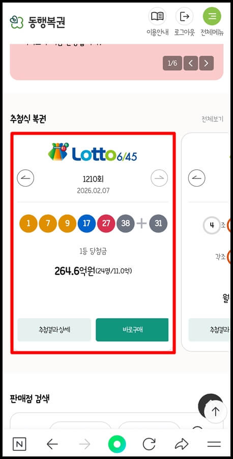 1. 회원가입을 마치고 예치금 충전까지 했다면 이제 로또 모바일 구매방법을 순차적으로 알려드리겠습니다. 로또 모바일 홈페이지에서 로그인 한 뒤 메인 화면에 있는 Lotto 6/45 바로구매 버튼을 클릭한 뒤 번호 선택하기를 클릭합니다.