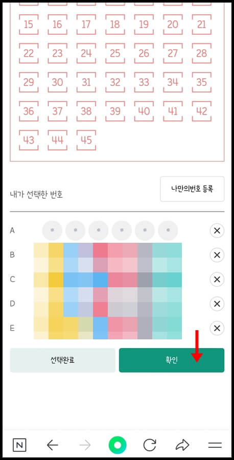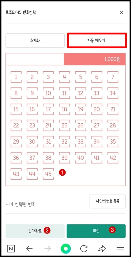 2. 그럼 자동채우기를 클릭하거나 직접 숫자를 클릭한 뒤 선택완료를 먼저 누르고 확인 버튼을 클릭합니다. 6개의 숫자를 한번 선택할때마다 선택완료 버튼을 누르고 확인 버튼을 눌러줘야 하며 자동채우기, 수동채우기를 섞어서도 선택이 가능합니다.
