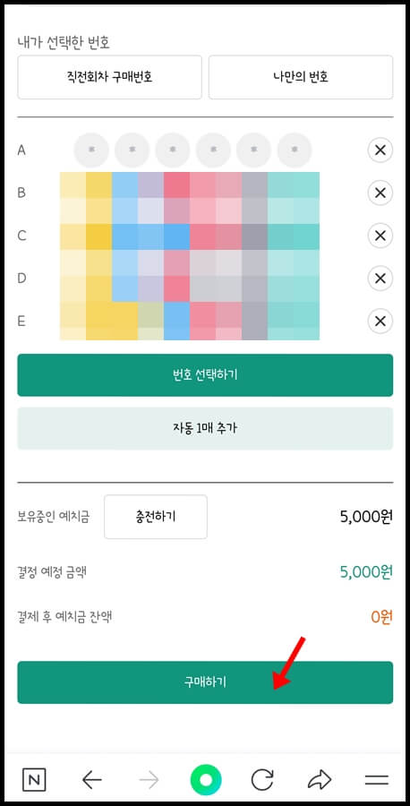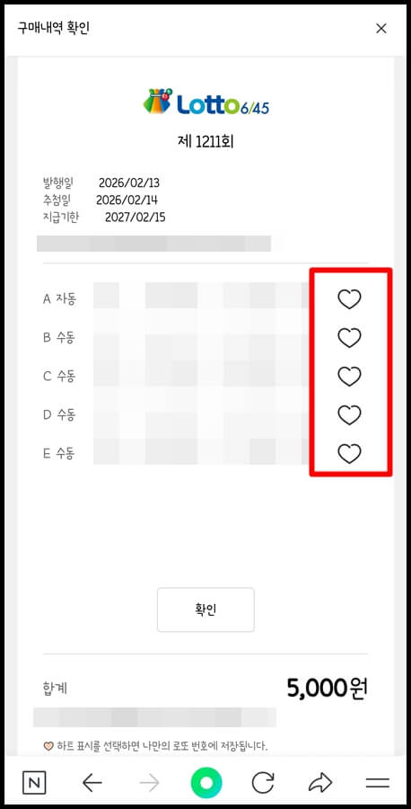 3. 그렇게 A부터 E까지 번호를 선택했다면 구매하기 버튼을 누르고, 구매내역을 확인 한 뒤 확인 버튼을 누르면 끝입니다. 여기서 숫자 옆에있는 하트를 클릭하면 나만의 로또 번호에 저장이되는데 나중에 번호를 선택할때 나만의 번호 버튼을 클릭해서 활용할 수 있습니다.