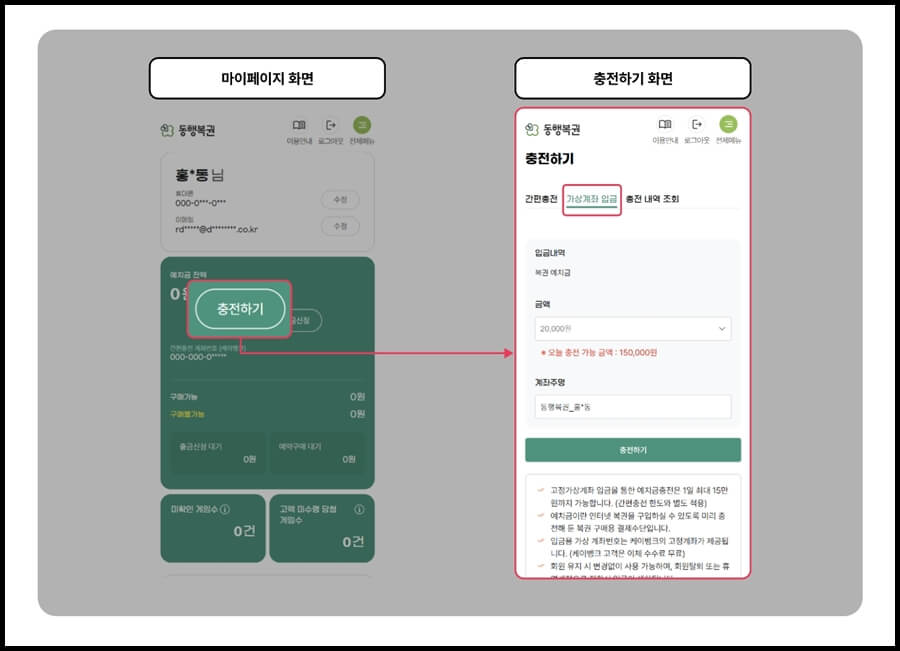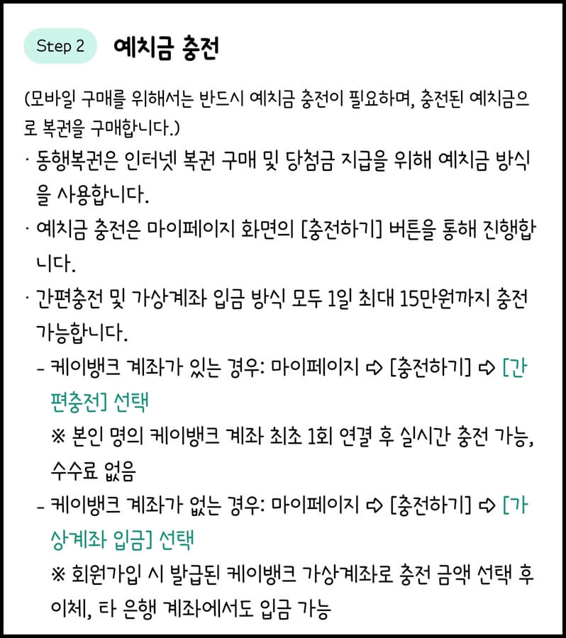 회원가입을 마쳤다면 복권을 구매할 비용인 예치금을 충전해야 합니다. 로또 모바일 구매방법의 핵심은 케이뱅크 계좌를 연동하거나 가상계좌를 발급받는 것입니다. 마이페이지의 충전하기 메뉴를 이용하며 1일 최대 15만 원까지만 충전이 가능합니다. 케이뱅크 계좌가 있다면 간편 충전을 통해 수수료 없이 실시간으로 예치금을 확보할 수 있어 편리하며 없는 경우에는 가상계좌 입금 방식을 활용합니다.