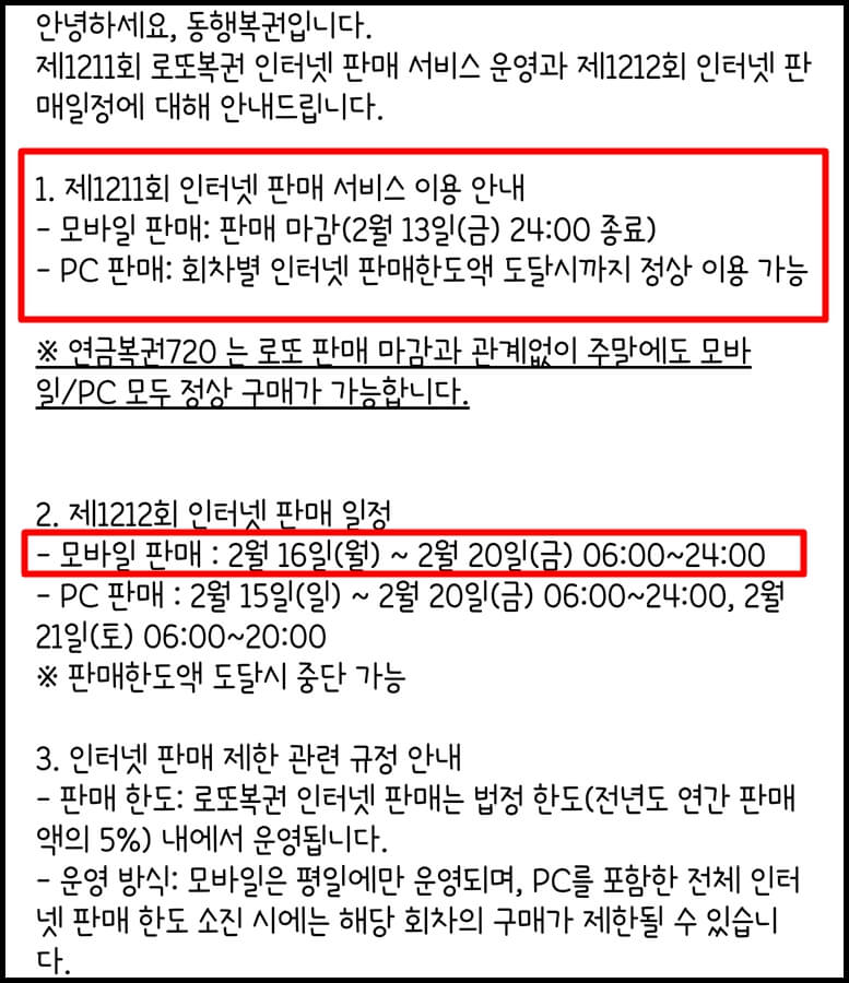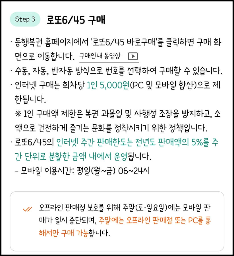 앞서 얘기했듯이 모바일 로또 홈페이지를 통한 구매는 1인 5,000원의 한도로만 구매할 수 있으며 모바일 이용시간은 평일 월~금 오전 6시부터 24시까지만 가능하니 참고 바랍니다.