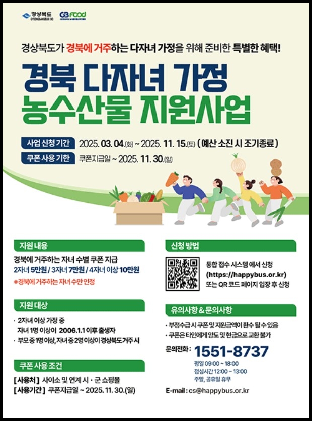여기에 경북도에서는 2자녀 이상, 자녀 중 1명 이상이 19세 미만인 다자녀 가정에게 농수산물 구입 쿠폰을 제공하는 사업도 하고 있는데요~ 지급 금액은 자녀수에 따라 달라지고, 2자녀는 5만 원, 3자녀는 7만 원, 4자녀 이상은 10만 원 쿠폰이 제공돼요. 단, 다자녀 농수산물 쿠폰은 직접 신청을 해야 하고, 사이소 및 연계 시. 군 쇼핑몰에서 11월 30일(일)까지 사용이 가능해요. (통합접수 시스템 : https://happybus.or.kr/)
