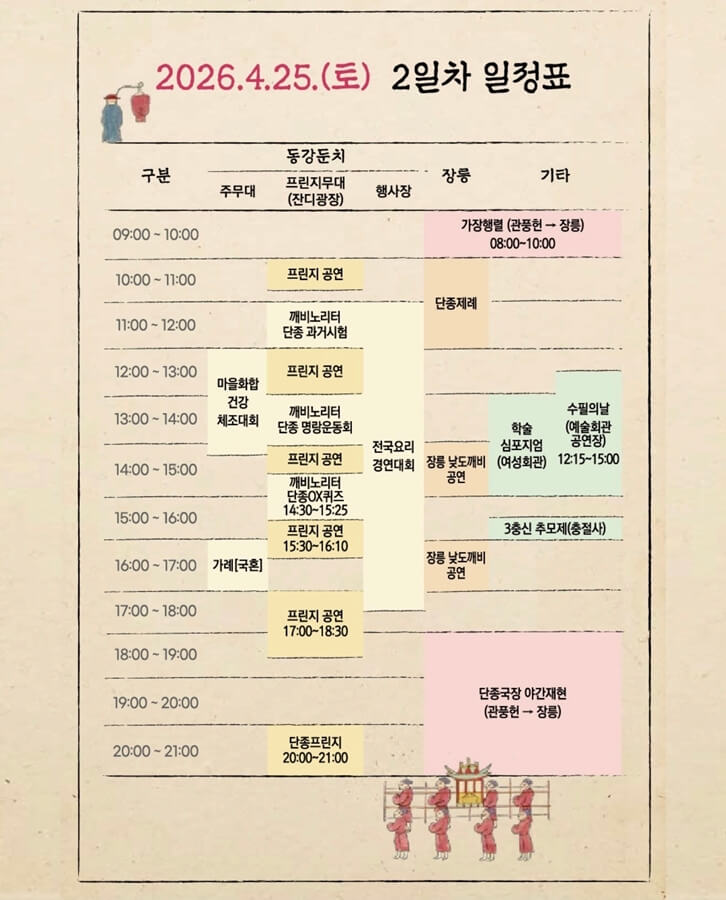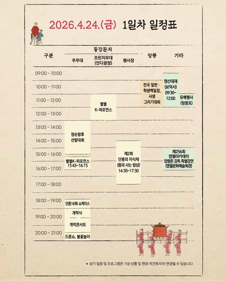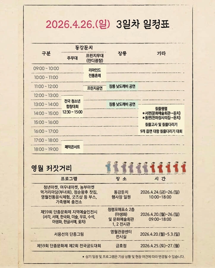2026 영월 단종문화제 제59회가 4월 24일~26일 열립니다. 단종국장 재현, 드론쇼, 장항준 감독 특강, 정순왕후 선발대회 등 주요 프로그램과 관람 꿀팁을 한번에 확인하세요.