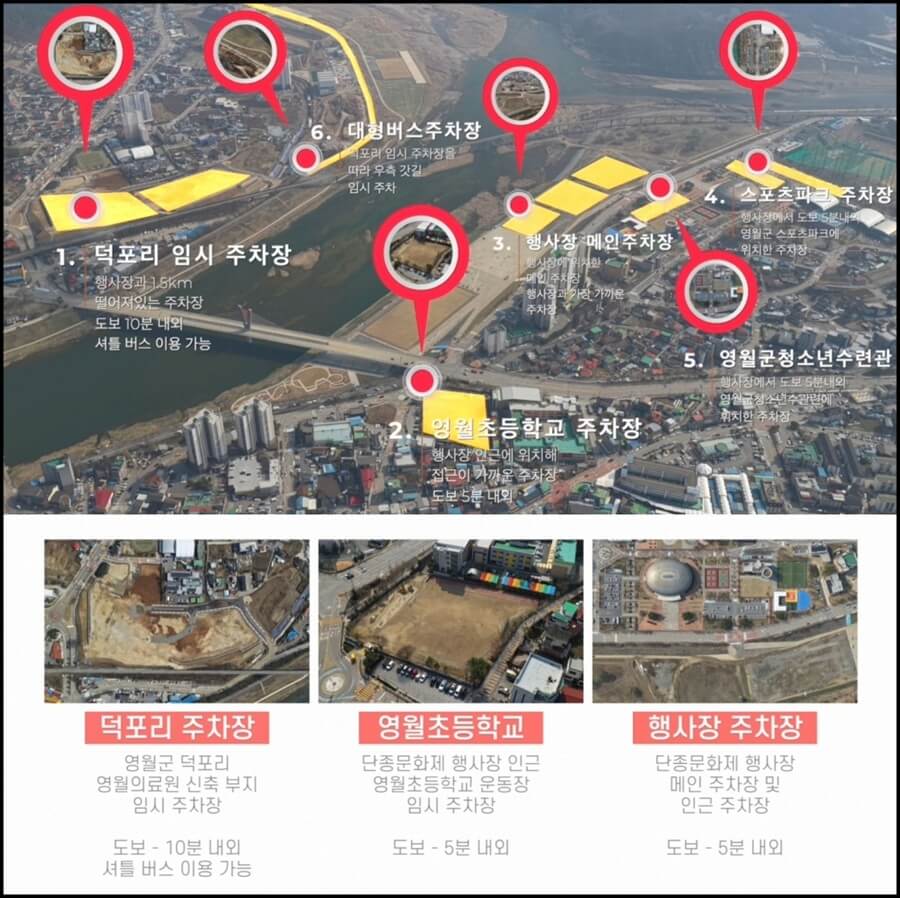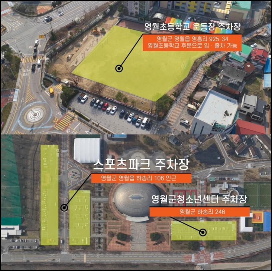 A3. 영월초등학교 운동장과 스포츠파크 주차장 등 도보 5분 거리 주차장과 셔틀버스가 연계된 덕포리 임시 주차장이 있습니다.