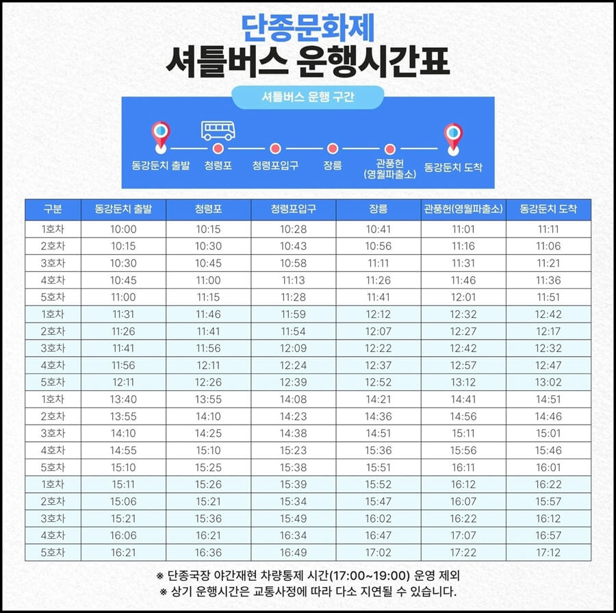 A5. 4월 25일 토요일 오후 5시부터 7시까지 단종국장 야간재현 행사로 인해 일부 구간 차량이 통제되며 셔틀 운행도 제외됩니다.