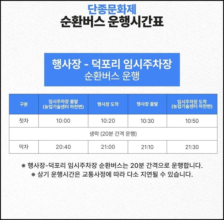 A4. 행사장과 덕포리 임시주차장을 연결하는 순환버스는 오전 10시부터 20분 간격으로 운행하여 편리하게 이용 가능합니다.