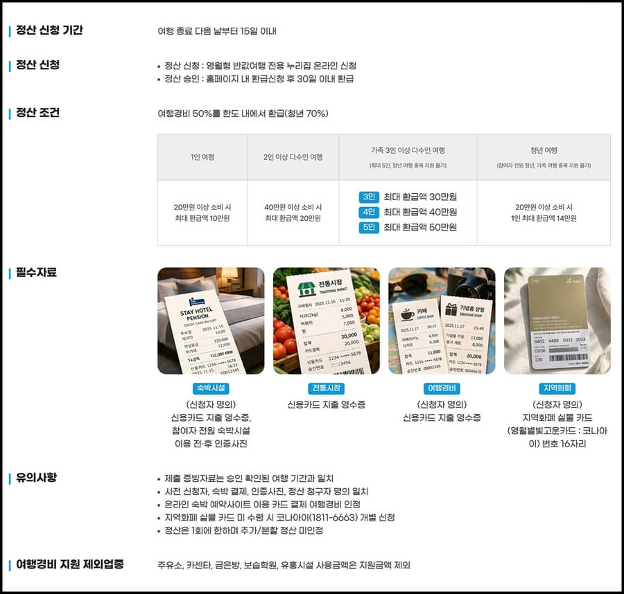 이번 사업은 영월을 방문하는 관광객에게 여행 경비의 50%를 영월별빛고운카드라는 지역화폐로 돌려주는 특별한 혜택입니다. 환급 한도는 1인 여행객의 경우 최대 10만 원이며, 2인 이상이 함께 여행할 때는 최대 20만 원까지 지원받을 수 있습니다. 경비를 크게 절약할 수 있는 만큼 성공적인 환급을 위해 정확한 영월 반값여행 신청 절차를 숙지하는 것이 매우 중요합니다.