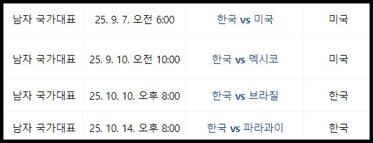 2025년 9월과 10월은 대한민국 축구팬들에게 중요한 시기입니다. 첫번째 경기는 9월 7일(일) 오전 6시, 미국 뉴저지의 레드불 아레나에서 미국 대표팀과 경기를 치르고, 두 번째 경기는 9월 10일(수) 오전 10시 30분, 테네시주 내슈빌의 지오디스 파크에서 멕시코 대표팀과 경기를 치러요. 이렇게 9월 경기가 끝나고 나면 10월 10일(금) 오후 8시에 브라질, 10월 14일(화) 오후 8시에 파라과이와 홈경기를 앞두고 있어요.
