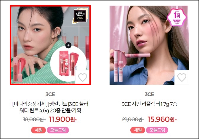이번에는 고1 여조카가 추천해 준 건데요~ 3CE 블러 워터 틴트하고, 어바웃톤 블러 파우더 팩트예요. 틴트는 저도 한 번씩 빌려 쓰는데 조카가 사용하고 있는 핑크 구아바 색상이 부담스럽지 않고 발림성도 좋더라고요.