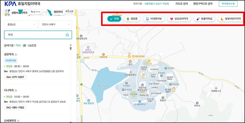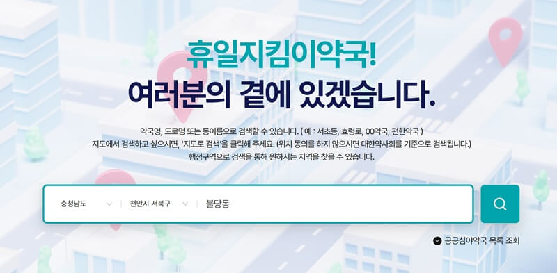 요렇게 웹사이트나 모바일에서 휴일지킴이약국으로 접속한 뒤 지역을 선택하면 바로 영업 중인 우리동네 공휴일 문여는 약국을 조회할 수 있어요.