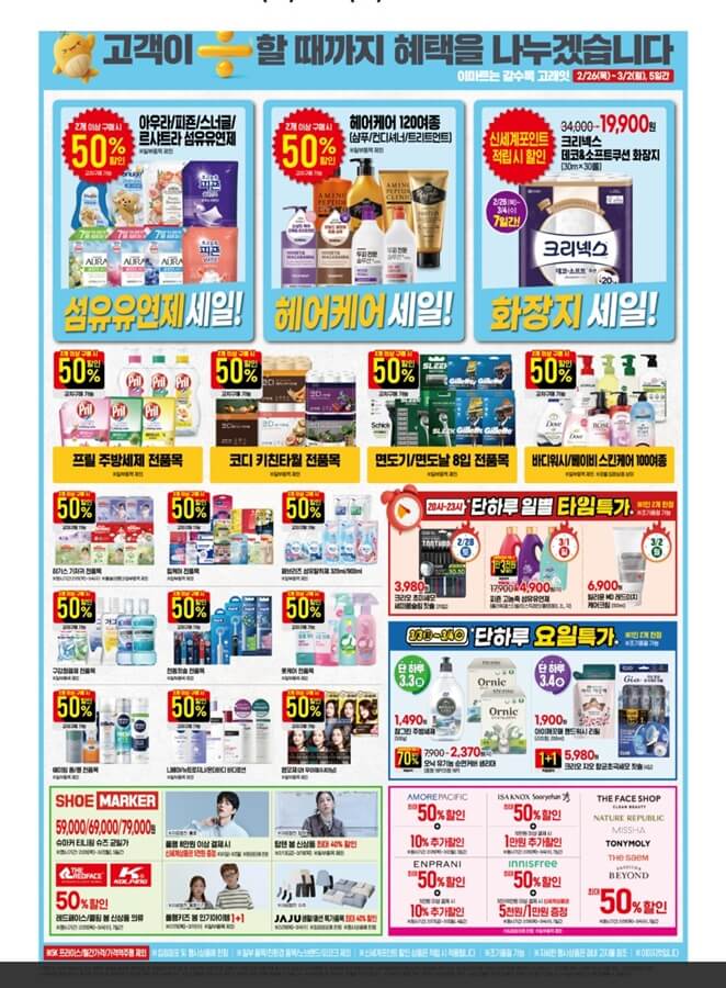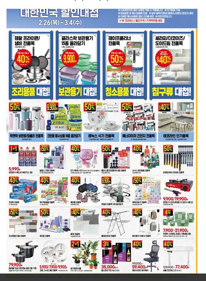 알뜰한 쇼핑을 위해서는 전체 카탈로그 내 쿠폰 일정을 가장 먼저 확인해야 합니다. 10만 원 이상 결제 시 5천 원을 할인받을 수 있는 1차 쿠폰은 3월 4일까지 발급 및 사용이 가능합니다. 2차 쿠폰은 3월 3일에 새롭게 오픈하여 11일까지 발급받고 십일일까지 매장에서 적용할 수 있습니다. 결제 전 미리 쿠폰 혜택을 챙기는 것이 매우 유리합니다.