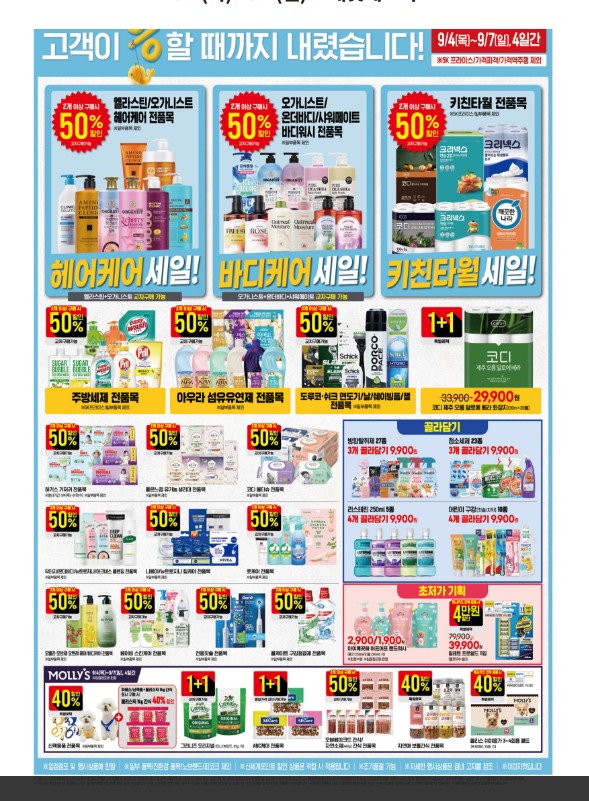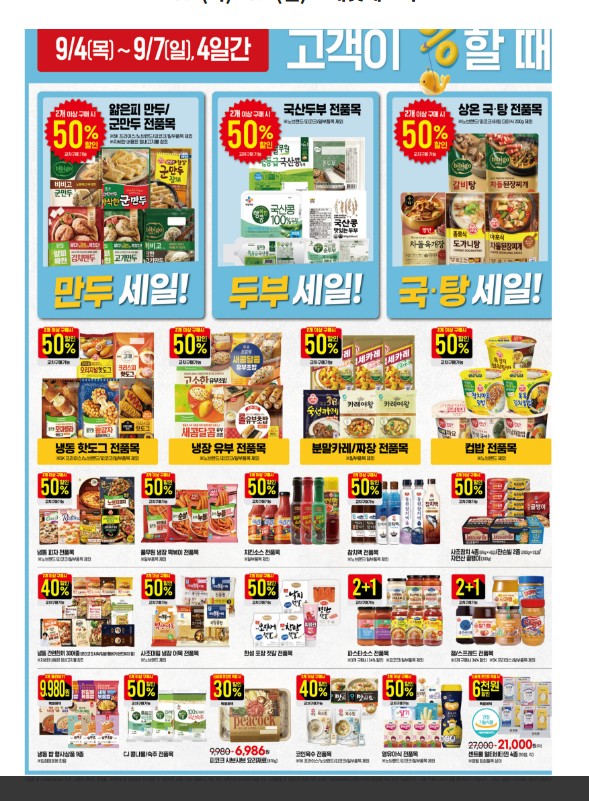 항상 그래왔듯이 이마트 고래잇 페스타 9월 전단지를 보면 먹거리뿐만 아니라 생활용품도 반값으로 구매할 수 있는데요~ 만두, 두부, 시리얼, 치즈, 컵밥, 수입버터, 냉동피자 등과 세제, 바디워시, 건전지, 하기스 기저귀 등 생활필수품들을 할인가에 선보일 예정이에요.