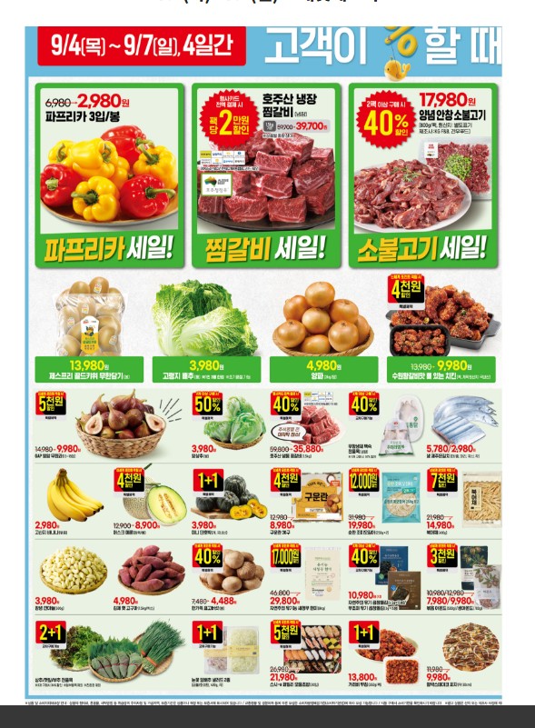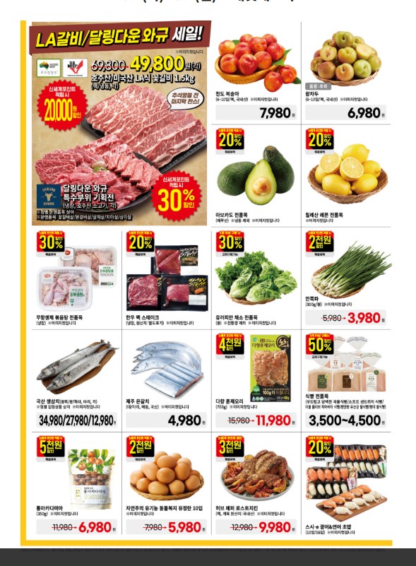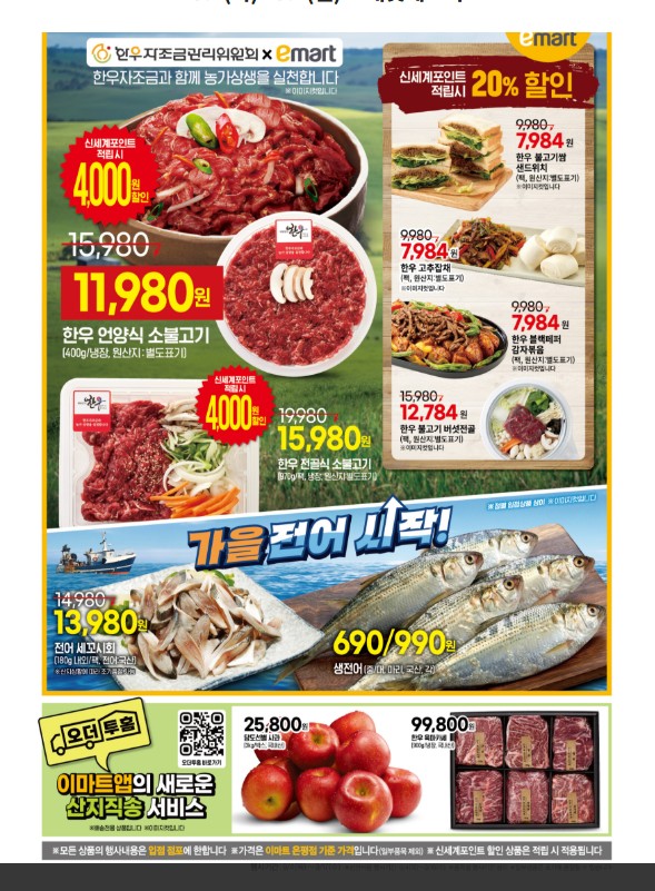 이마트 고래잇 페스타 9월 전단지 상품들만 할인 대상이기 때문에 미리 이마트 전단지를 확인한 뒤 장보기 리스트를 꾸려보는 것도 좋은데요~ 과일 할인에서 포인트 적립 조건인 경우가 많기 때문에 신세계 포인트 적립은 필수이고, 등심 탕수육이나 메밀면 등 일부 상품은 행사카드 결제 시 추가 할인이 적용되기 때문에 행사카드도 꼭 챙겨야 해요.