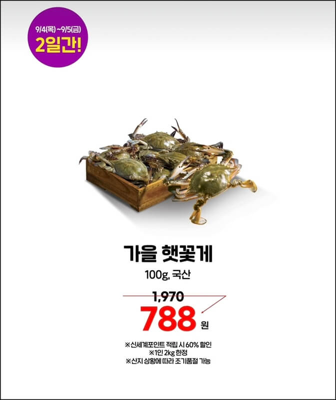 9월 이마트 고래잇 페스타에서는 햇꽃게, 햇사과, 한우, 삼겹살, 계란, 자연산 참다랑어회 등 신선식품을 할인 판매 하는데요~ 샤인머스캣은 신세계포인트 적립 시 11,940원에 선보이고 파머스픽 하우스 감귤은 단돈 9,900원에 선보인다고 해요.