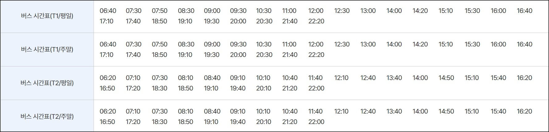 바로 아래에서 평일과 주말에 따른 시간대별 인천공항 버스시간표를 확인할 수 있으며