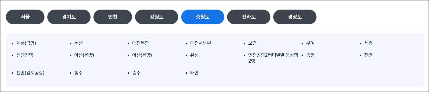천안으로 출발하는 인천공항 버스시간표 조회하기 위해 충청도 > 천안 순으로 선택을 하면