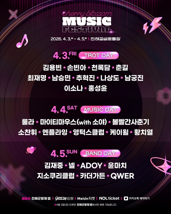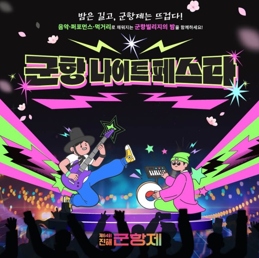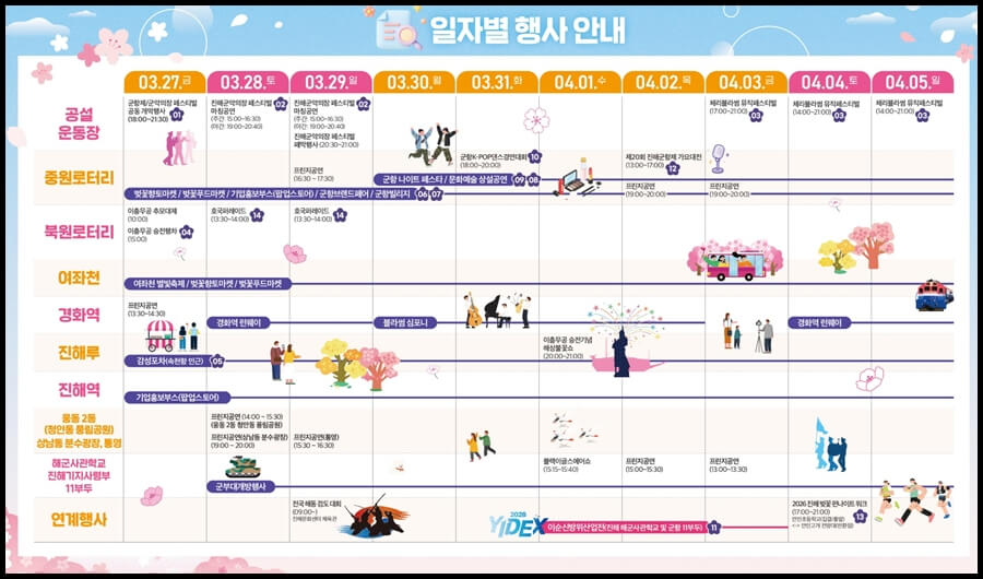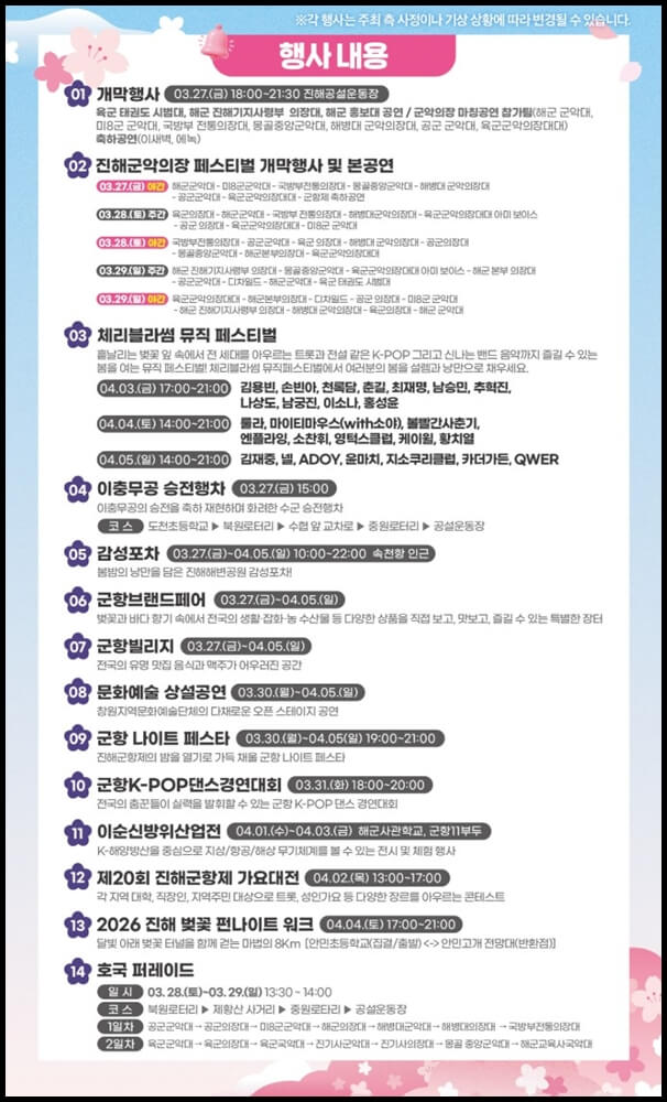 3월 27일 개막식에서는 군악대와 의장대의 화려한 공연을 시작으로 4월 3일에는 김용빈, 손빈아 등 유명 가수의 축하 무대가 4월 5일까지 계속해서 펼쳐집니다.