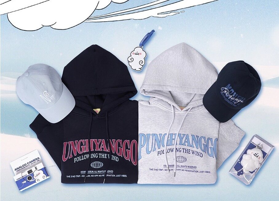 일상생활과 여행지에서 유용하게 활용할 수 있는 총 5종의 아이템으로 구성되어 있습니다. 가장 인기가 많은 후드티는 네이비와 라이트그레이 두 가지 색상으로 육만 칠천 원에 책정됩니다. 볼캡은 두 가지 디자인으로 삼만 삼천 원입니다. 이외에도 풍향고2 후드티, 모자 굿즈 구매하는 방법을 찾아보시는 분들은 일회용 필름카메라와 구름장수 인형키링, 러기지택 등 다양한 소품류도 함께 확인하실 수 있습니다.