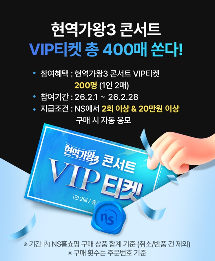 투표와 더불어 현역가왕 시즌3 콘서트를 현장에서 직접 즐길 수 있는 특별한 이벤트가 함께 진행 중입니다. NS홈쇼핑과 연계하여 진행되는 이번 행사는 총 400매의 VIP 티켓을 경품으로 제공하며 추첨을 통해 선정된 200명에게 1인당 2매씩 증정합니다. 방송의 감동을 직접 눈앞에서 생생하게 느낄 수 있는 절호의 기회인 만큼 현역가왕 시즌3 투표하기와 함께 이벤트 참여 조건도 꼼꼼히 확인해 보는 것이 유리합니다.