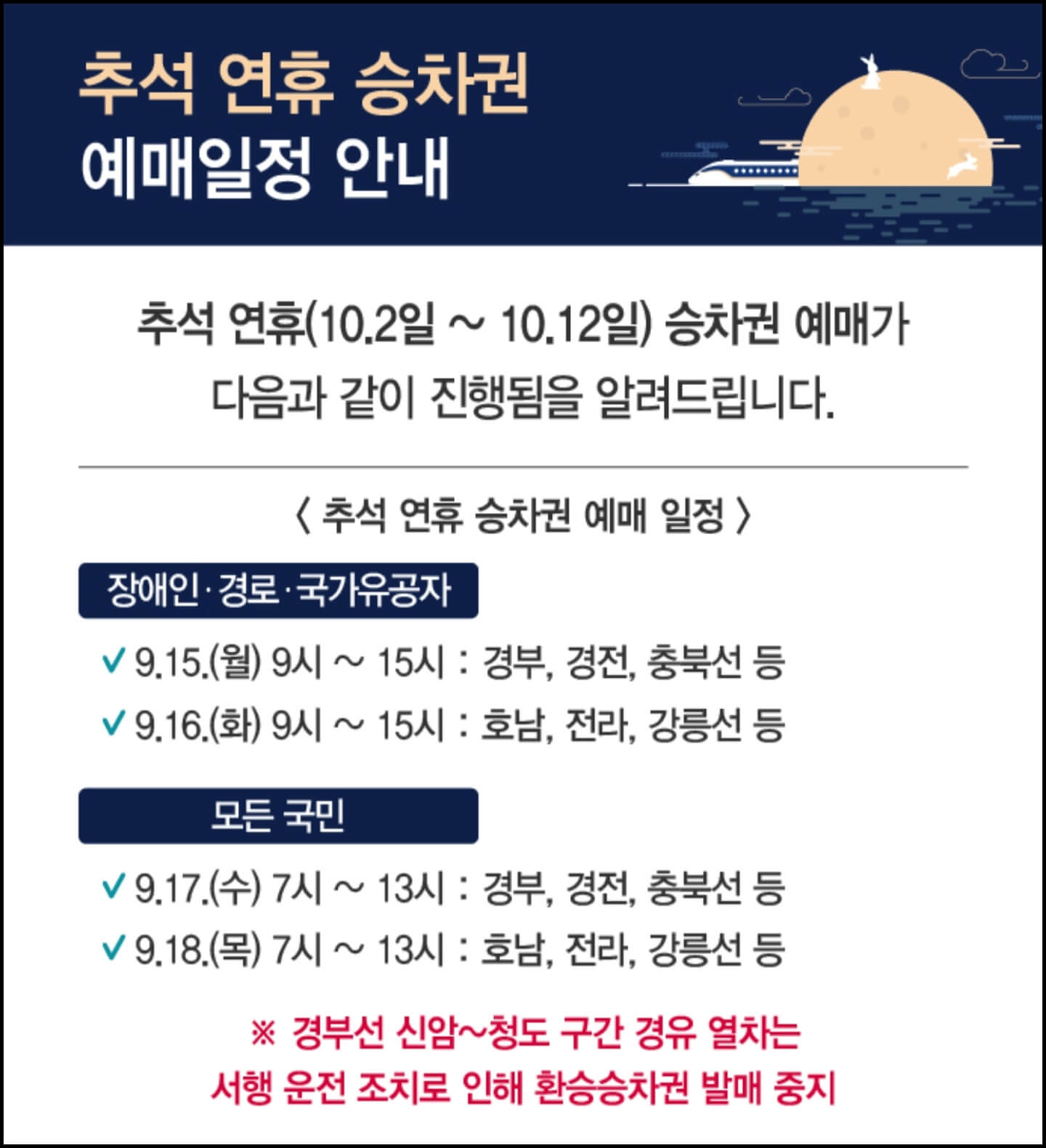 - 추석 기간 중 증편 운행으로 평소보다 20% 더 많은 열차가 운행될 예정
