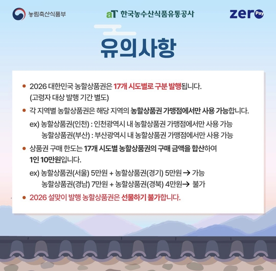 대한민국 농할상품권은 국산 신선 농축산물의 소비 활성화를 위해 정부가 발행하는 제로페이 기반의 모바일 상품권입니다. 소비자는 상품권을 구매할 때 즉시 30% 할인을 적용받아 10만 원권 상품권을 7만 원에 구매하는 효과를 누립니다. 2026년부터는 전국 단일권이 아닌 서울, 경기, 부산 등 17개 시도별로 구분하여 발행하는 방식으로 변경되었습니다. 따라서 본인이 주로 소비하는 지역의 상품권을 선택하여 구매해야 하며 각 지역 내 가맹점에서만 사용이 가능하도록 제도가 개편되었습니다.