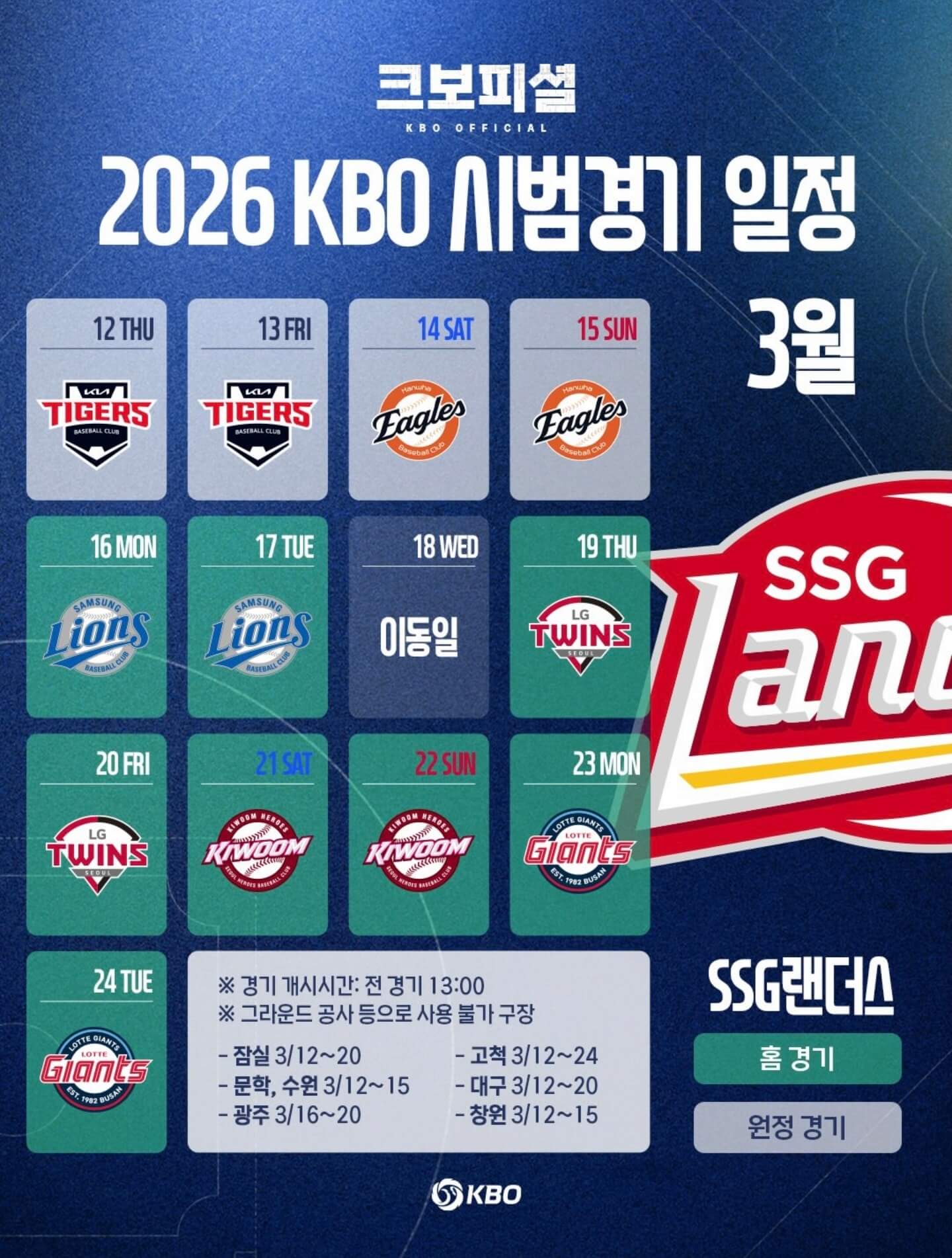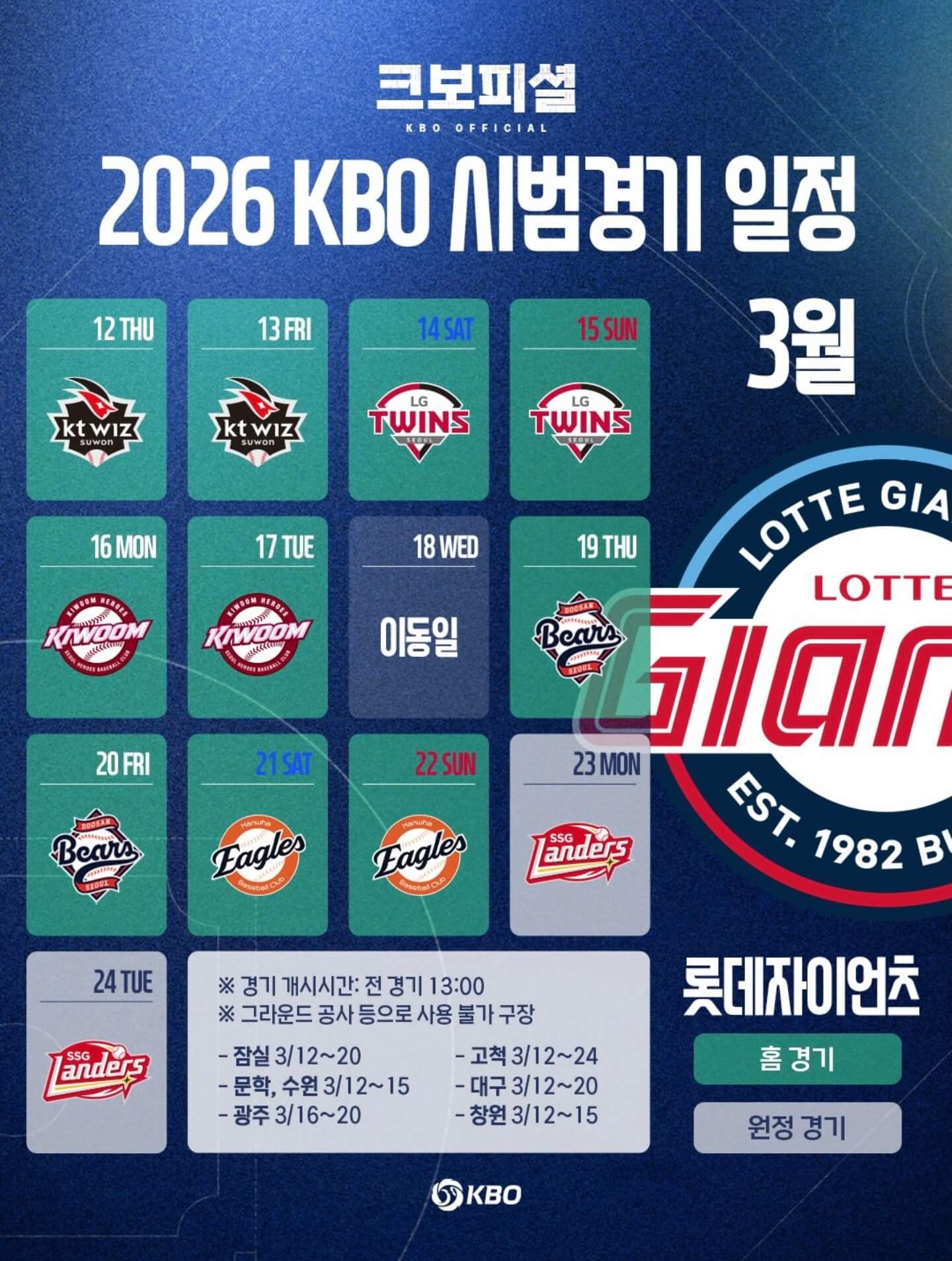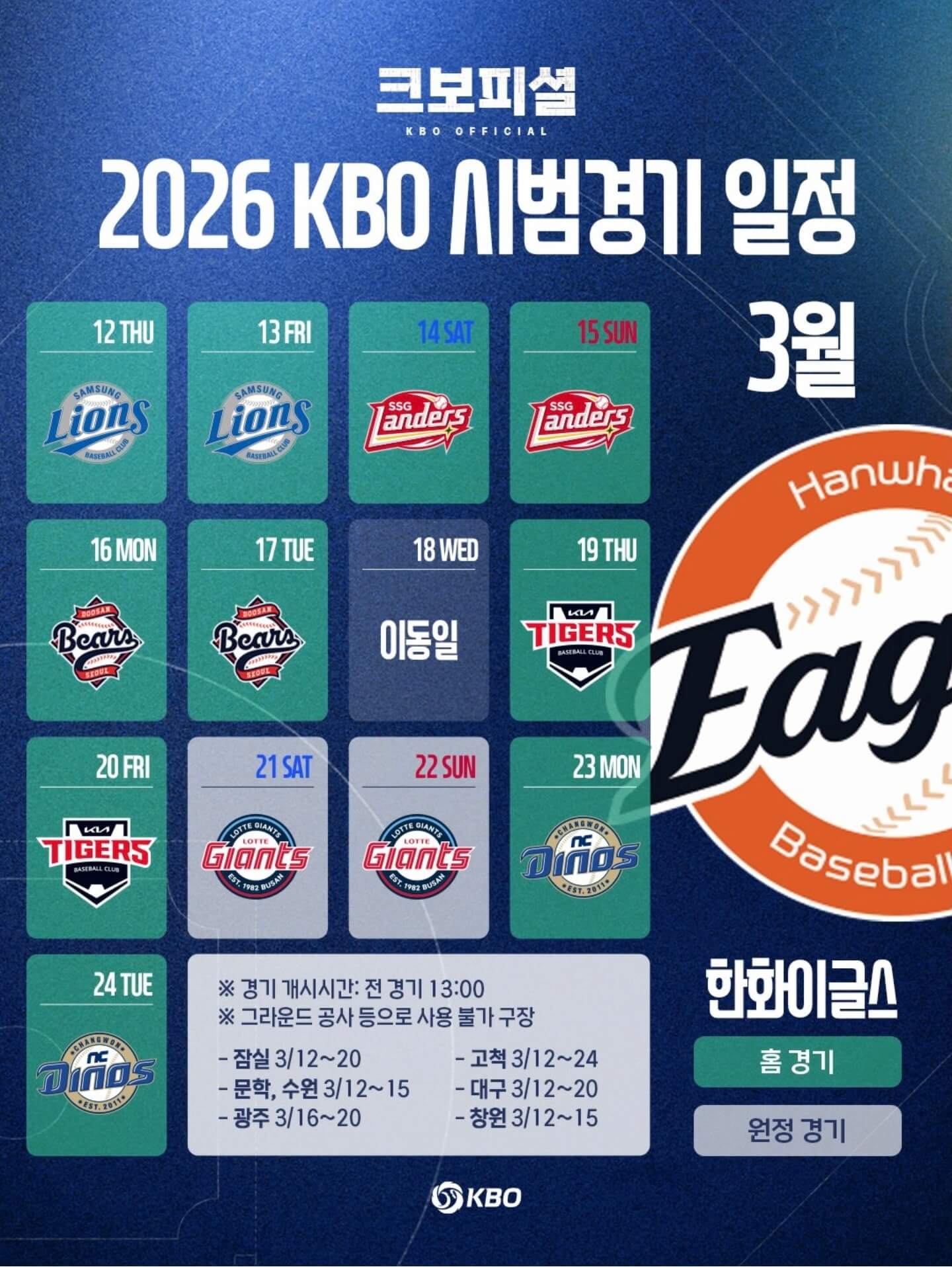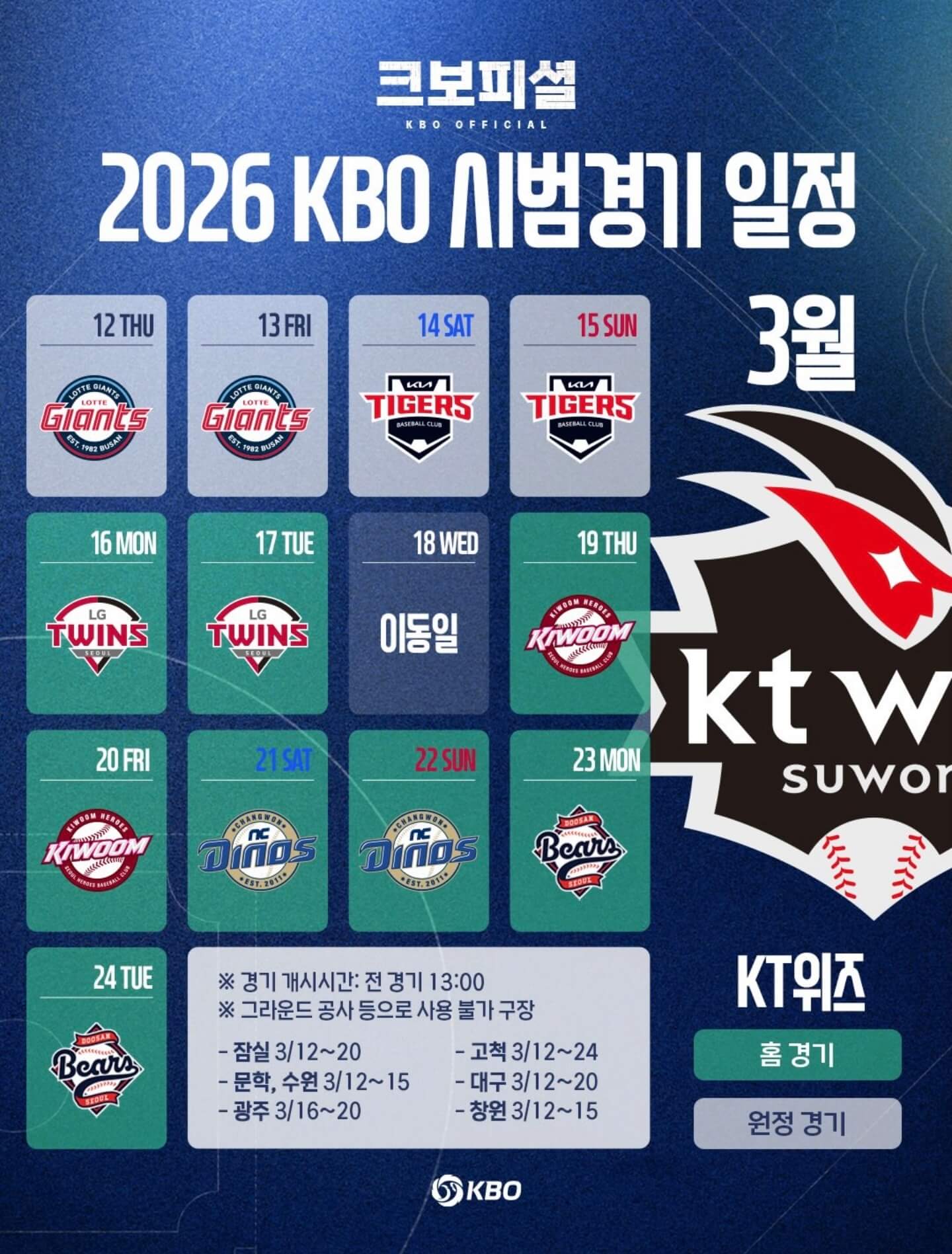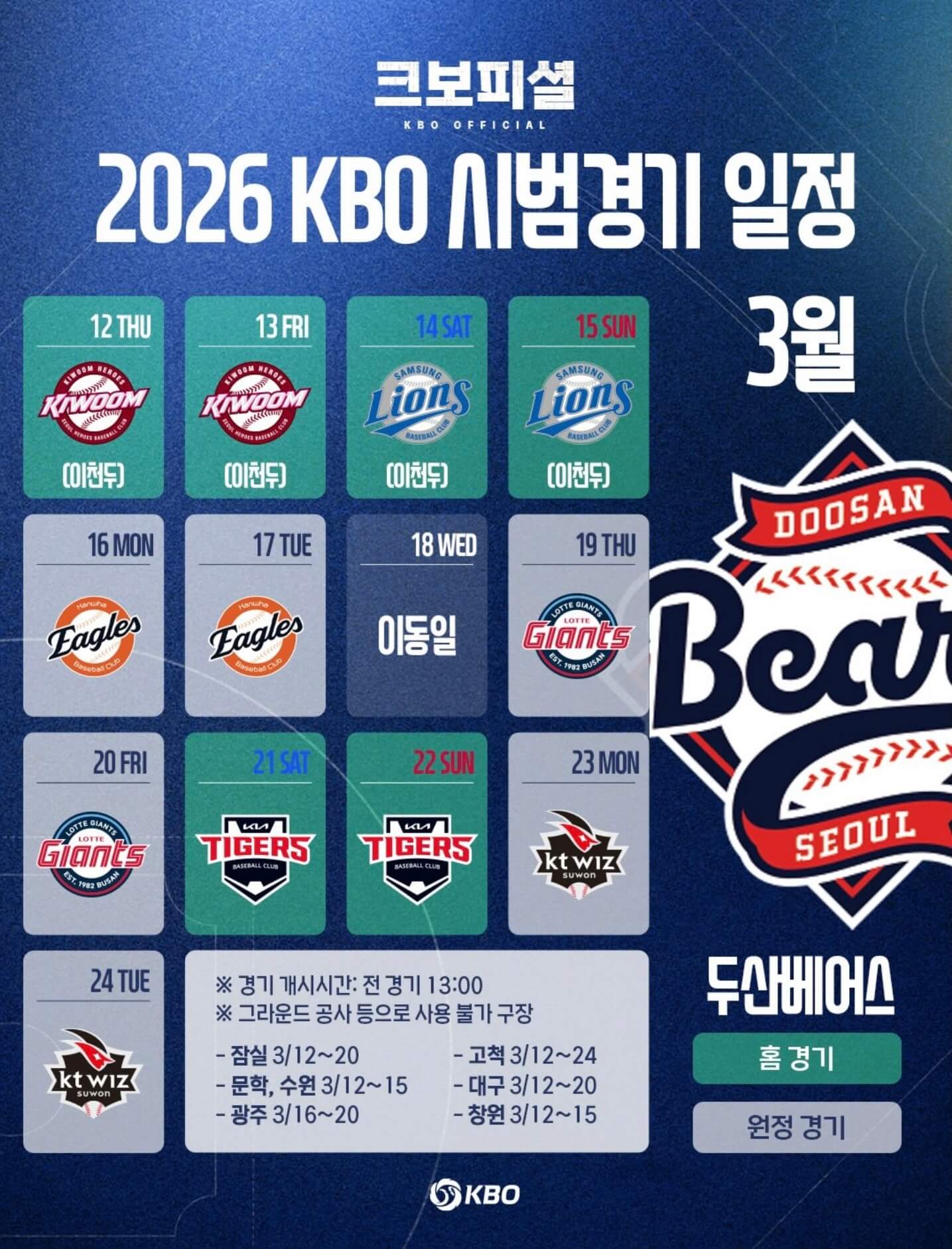 가장 큰 변화를 겪는 구단은 키움 히어로즈와 두산 베어스입니다. 고척스카이돔은 3월 12일부터 시범경기 종료일인 24일까지 공사가 이어져 키움은 시범경기 전 일정을 원정으로 소화해야 하는 강행군을 펼칩니다. 잠실구장을 쓰지 못하는 두산 베어스는 3월 12일부터 15일까지 열리는 개막 시리즈를 퓨처스리그 구장인 이천 베어스파크에서 개최하는 이례적인 결정을 내렸습니다. 팬들에게는 이천에서 1군 선수들을 만나는 색다른 경험이 될 것입니다.