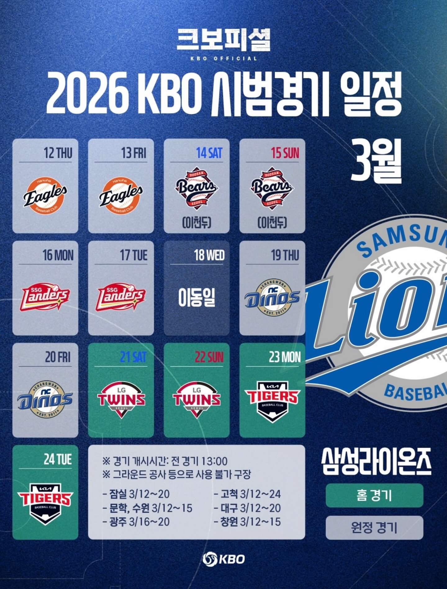 2026 KBO 프로야구 시범경기 일정이 확정됐습니다. 3월 12일부터 24일까지 팀당 12경기씩 총 60경기가 펼쳐지며, 개막전 구장과 주요 일정을 한눈에 정리했습니다.