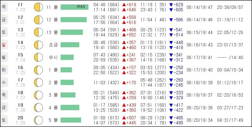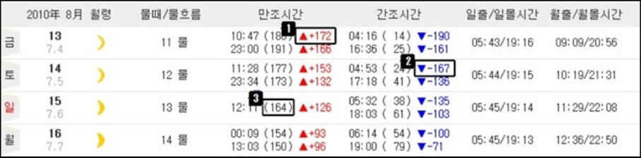 위의 이미지에서 만조시간에 표시되어있는 ▲+172는 간조 이후에 차오른 해수면의 높이 차이이고, 반대로 ▼-167은 만조에서 빠진 해수면의 높이 차이를 뜻해요. +수치의 숫자가 클수록 물이 많이 차있고, -수치의 숫자가 적을수록 물이 많이 빠졌다고 생각하면 돼요. 그리고 시간 옆 괄호에 적힌 숫자는 물의 높이를 뜻해요.