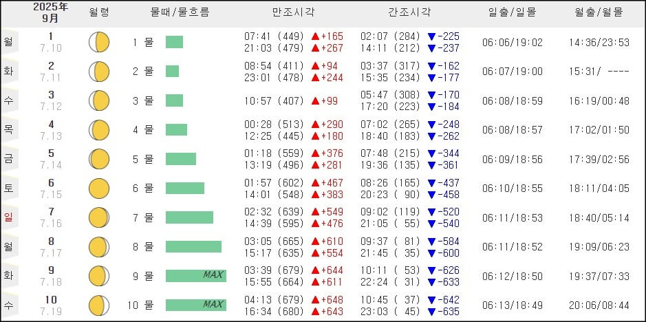 9월 서해안 물때표시간