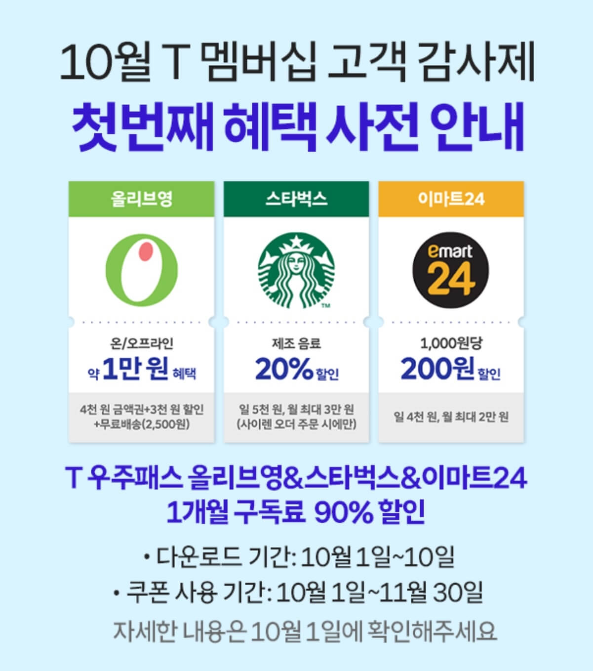 10월 첫번째 skt 고객감사제의 주요 혜택으로 T우주의 인기 구독 상품인 올리브영&스타벅스&이마트 24 패키지를 월 9,900원에서 단 990원에 이용할 수 있는 쿠폰이 제공돼요. 이는 10월 1일부터 10일까지 멤버십 앱을 통해 다운로드가 가능하며 이를 통해 최대 6만 원가량의 혜택을 누릴 수 있어요. 무엇보다 T우주 구독 상품은 8월에 출시된 이후 고객들 사이에서 높은 인기를 얻고 있는 서비스예요.