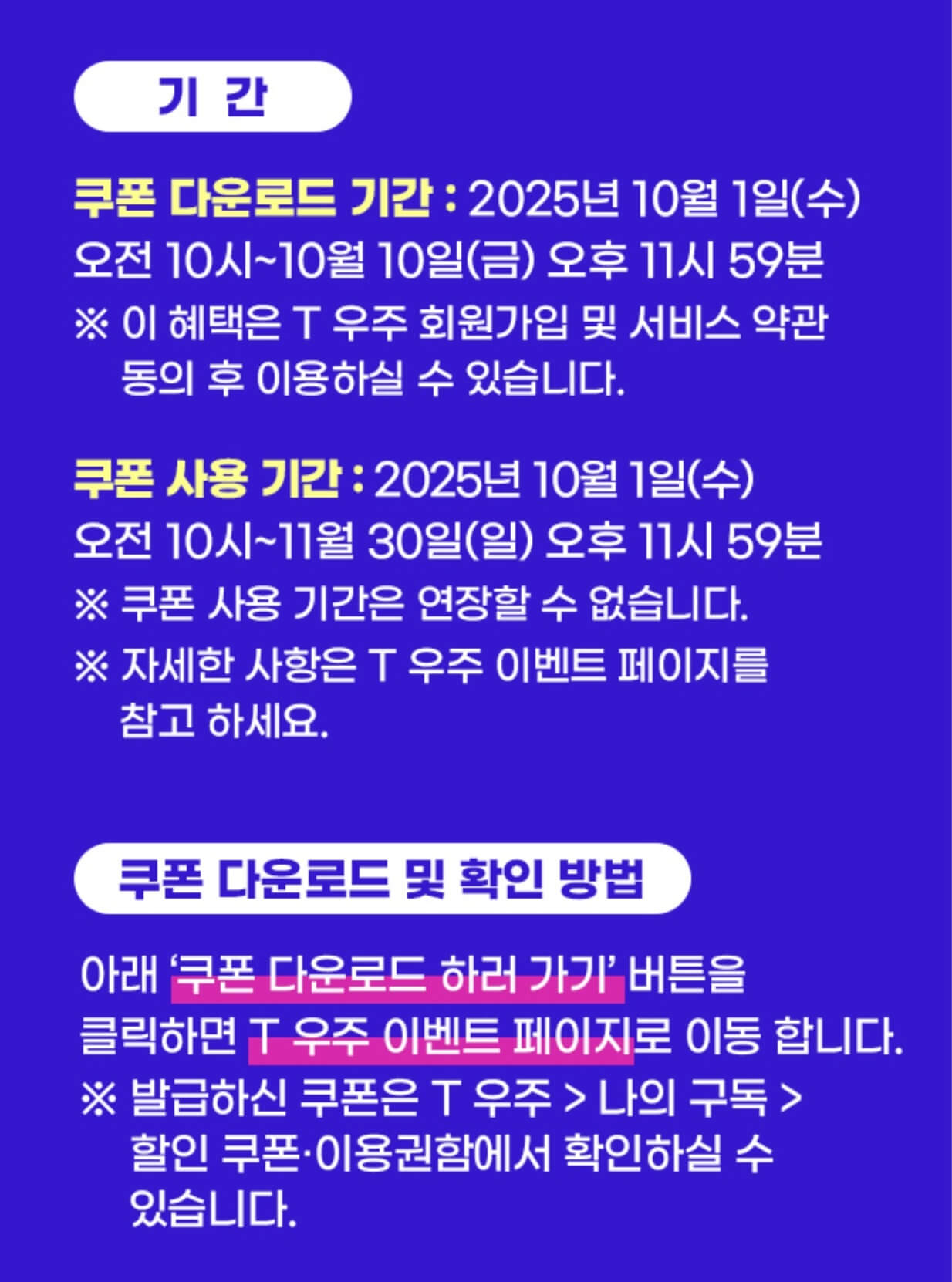 skt 고객감사제 10월 첫 번째 T우주 쿠폰은 25년 10월 1일(수) 오전 10시부터 10월 10일(금) 오후 11시 59분까지 다운로드할 수 있고, 10월 1일(수) 오전 10시부터 11월 30일(일) 오후 11시 59분까지 사용이 가능해요. 이 혜택은 T우주 회원가입 및 서비스 약관 동의 후 이용할 수 있으며 쿠폰 사용 기간은 연장할 수 없으니 참고하세요.